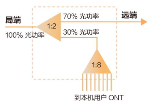 不等比分光器(如圖1)是把局端來(lái)的100%光功率信號(hào)進(jìn)行不等比例分光,70%的光功率輸出到遠(yuǎn)端,30%的光功率留用到本機(jī)用戶,再進(jìn)行等比例分光到本機(jī)用戶。雖然本機(jī)用戶僅留分了30%的光功率,但也能夠滿足本機(jī)用戶的需要。