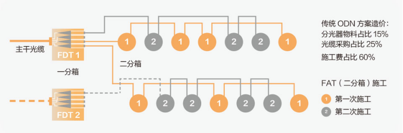 自FTTH技術(shù)方案開始推行,分光器都是等比分光,連接都是熔纖或冷接,這也被稱為傳統(tǒng)方案或ODN 1.0。八年前,部分供應(yīng)商把入戶段光纜與FAT連接,實(shí)現(xiàn)了入戶段預(yù)連接,這被稱為ODN 2.0方案。2018年開始,華為在ODN 2.0的基礎(chǔ)上逐步實(shí)現(xiàn)了配線段光纜與第二級(jí)分光器的預(yù)連接,以及第二級(jí)分光器FAT的不等比例分光,又把饋線段光纜與第一級(jí)分光器實(shí)現(xiàn)了預(yù)連接,即真正實(shí)現(xiàn)了全預(yù)連接、級(jí)聯(lián)和不等比分光技術(shù)的完整解決方案,這也被稱為ODN 3.0技術(shù)解決方案。