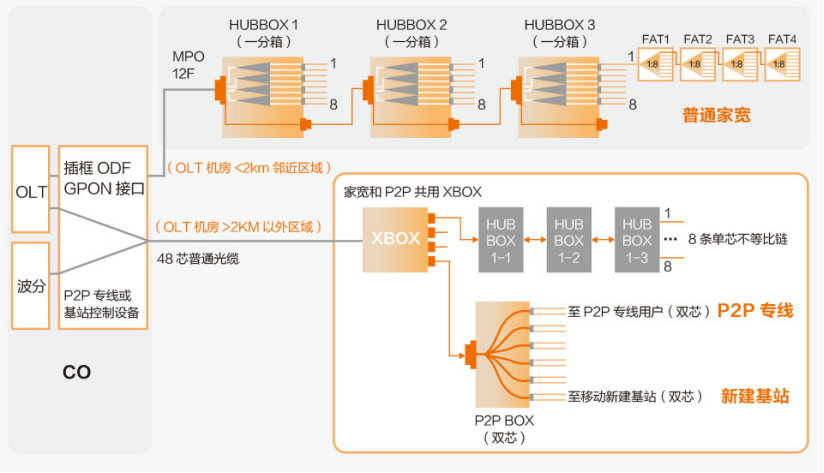 通過(guò)ODN 3.0解決方案提供的P2P BOX可以直接輸出雙芯光纜到P2P專線用戶和移動(dòng)基站,特別適合綜合運(yùn)營(yíng)商進(jìn)行網(wǎng)絡(luò)布局和充分利用骨干光纜資源。