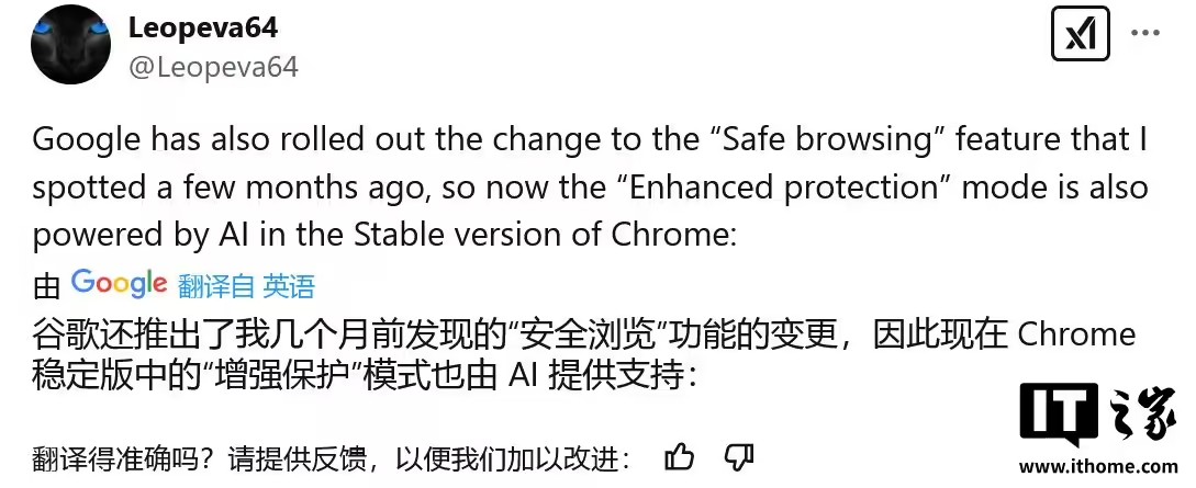IT之家 2 月 17 日消息,消息源 @Leopeva64 昨日(2 月 16 日)在 X 平臺發(fā)布推文,稱在經(jīng)過 3 個月的 Canary 頻道測試后,谷歌 Chrome 瀏覽器穩(wěn)定版已全平臺上線全新“增強保護”(Enhanced protection)功能,在現(xiàn)有功能基礎(chǔ)上,通過 AI 實時防護危險網(wǎng)站、下載和擴展程序等。